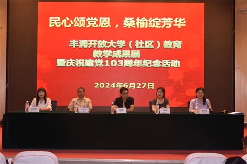 6月27日 ,丰润老年开放大学在报告厅隆重举办教育教学成果展演暨庆祝建党103周年纪念活动。出席本次活动的有:唐山市社区教育学院社区教育督导专员马海阳处长、解瑜捷老师;丰润开放大学主任王守宽、副主任高明建、梁亚敬;全体丰润老年开放大学的师生。