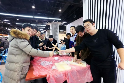在包饺子过程中,大家热情高涨,分工合作,有揉面的、有搓球儿的、有擀皮儿的还有裹馅儿的,“哎呀,你这个球儿搓的不圆啊,擀不圆的。”“哦哦,那我再搓搓。”,“哇塞,你这个饺子包的真好看呐,我的这个怎么这么丑?”“你这不仅仅是丑,这是要漏了啊哈哈哈!”小组成员之间不时互相开着玩笑提醒,高手们搓五六下擀面杖就擀出一个混圆的皮儿,将饺子馅放入皮中,捏一下中央,再由中间向两边将饺子皮边缘挤一下,三两下就捏出一个个肥嘟嘟的“小兔儿”,来自南方的同事们还包出了家乡特色的小笼包。