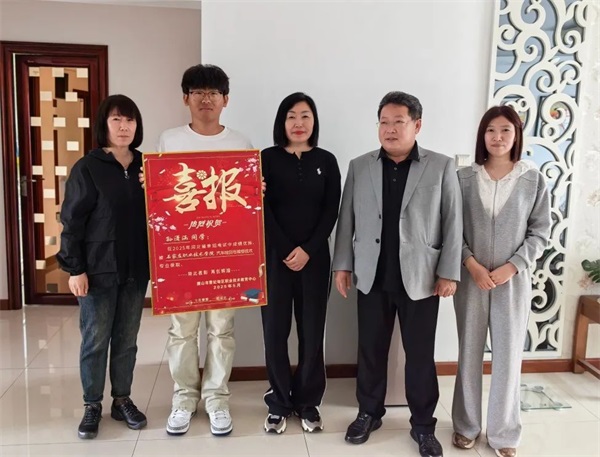 校务委员彭士业、升学部主任卢媛、副主任韩玉、22机械对口班班主任孙小莲一行为22机械对口、22天津春考班学生送去喜报,在2025年单招考试中,对口班陈文凯、王梓洋、杨浩宇、高铭泽同学以优异成绩被唐山工业职业技术学院、河北化工医药职业技术学院等河北省双高示范校录取;最引人注目的当数王艺洁同学,她在天津春季高考中突破本科线,被天津理工大学中环信息学院录取。从国家奖学金得主,到异地求学时老师们的云端护航,再到志愿填报的精准指导,王艺洁以锦旗致谢母校,用行动诠释了职教之路的无限可能。升学部卢媛主任欣慰地说:“她的成功,为所有学子点亮了前行的灯塔!”王艺洁家长对校领导的亲切慰问表示感谢,称赞是学校高质量教育教学工作给学生带来改变命运的机会。