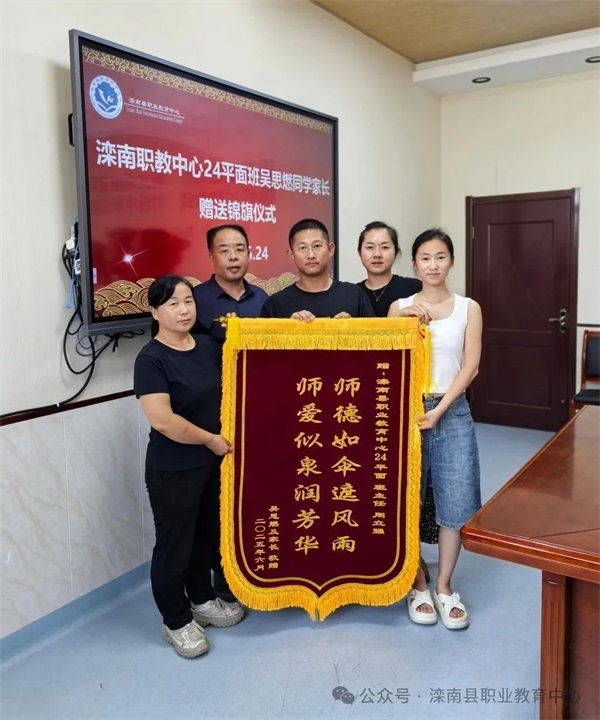 6月24日,滦南职教中心综合部24平面班吴思燃同学家长满怀感激之情,将一面印有“师德如伞遮风雨,师爱似泉润芳华”的锦旗送至学校,以此表达对班主任周立强老师及学校的深深谢意。副校长杨建军、张玉林、张新军,政教处主任李志远,综合部部长耿陶然、副部长王旋共同出席了赠旗仪式。
