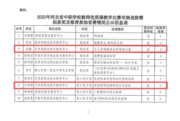 9月18日,唐山市教育局公布2025年河北省中等职业学校教师优质课教学比赛市级选拔赛评审结果,我校19名教师在此次赛事中表现亮眼,成绩优异,其中崔志会等7名教师获一等奖,江丽颖等5名教师获二等奖,邓杰等7名教师获三等奖;江丽颖、崔志会、王金等10名教师推荐角逐省级比赛。