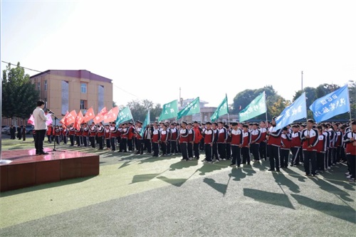 伴随着雄壮激昂的《义勇军进行曲》,升旗手振臂一挥,鲜艳的五星红旗冉冉升起,如同一团跃动的火焰,点燃了秋日的天空。全体师生行注目礼,高唱国歌,铿锵的旋律回荡在校园的每个角落,深植于每个人心中的是对祖国最崇高的敬意与最深沉的热爱。那抹迎风招展的中国红,是信仰的力量,是奋斗的号角,激励着每一位乐亭职校人砥砺前行。
