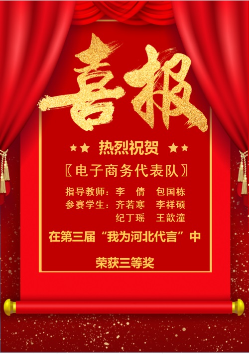 近日,第三届“我为河北代言”电商创业大赛赋能乡村全面振兴专项活动圆满落幕。唐山市第一职业中专电子商务代表队凭借扎实的专业素养、创新的直播思路和出色的现场表现,在27支参赛队伍中脱颖而出,荣获大赛三等奖!充分展现出一职学子在电商领域的专业实力与青春风采。