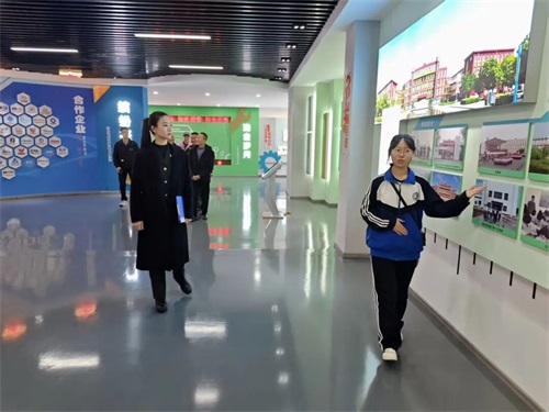 座谈结束后,在学校领导的陪同下,李思颖一行人参观我校的党建、团建广场,政教处张建平主任向李思颖及各位领导介绍了我校党建带团建,筑牢办学思想根基的核心理念。随后走进我校校史馆,聆听学生讲解,深入了解学校的发展历程、办学成就与文化传承。李思颖教练员对我校学生培养模式和校园文化给予了高度评价。