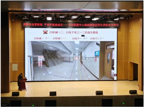校区安全员杨恩杰老师则以25级学生主演的情景小品为切入点,聚焦火场逃生中路线混乱、姿势错误、慌乱推搡、贪恋财物等四大常见误区,通过“错误示范+正确指导”的对比教学,让师生直观理解安全知识、掌握火场逃生“黄金法则”。结合校区建筑布局实际,杨老师向全体师生精准展示了教学楼各班级最快逃生路线及实景路线图。培训尾声,全体师生共同观看应急逃生演练示范教学片,直观学习规范疏散流程与动作要领,为后续实战演练筑牢基础。