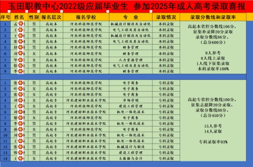 2025年玉田职教中心教学点成人高考高起专、高起本、专升本学员成绩斐然,再创辉煌!梦想成真!未来可期!专、本科总录取率达到98%。除社会考生外,我校2022级应届毕业生24人参加今年成人高考,其中9人报考高起本,全部录取,录取率100%;15人报考高起专,14人录取,录取率93%。