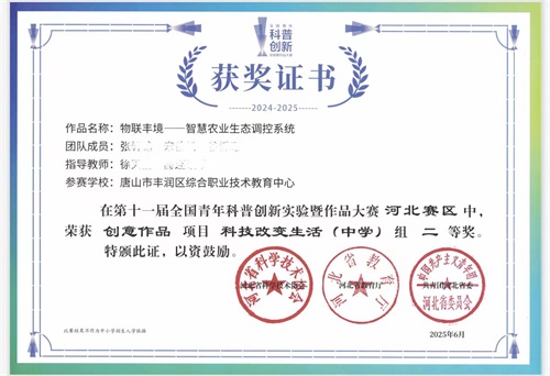 近日,第十一届全国青年科普创新实验暨作品大赛省赛结果正式揭晓,丰润综合职业技术教育中心师生奋勇争先、载誉而归,在科技改变生活(中学)组的激烈角逐中斩获两项二等奖,尽显学校科技创新教育与青年教师培养的丰硕成果。