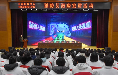 为深入贯彻落实艾滋病防控工作要求,进一步强化学生艾滋病防治意识,提升科学防护技能,营造“知艾防艾、关爱包容”的健康校园氛围,经丰南区疾控中心、教育局与丰南区职教中心(丰南高级技工学校)共同研究协商,定于2026年1月8日上午9时在学校报告厅举办艾滋病防控专题宣传活动。丰南区疾控中心副主任高志庆、性病艾滋病防制股股长范月冬及副股长董平,区教育局体艺卫股股长柳海龙、副股长杨艳泽,区职教中心副校长李春江、校长助理郑少东等领导嘉宾出席本次活动,中医护理专业全体学生全程参与。活动由学校安全卫生处主任赵秀山主持。