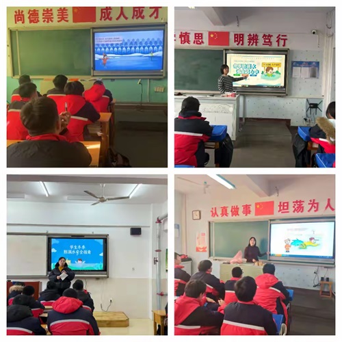 各班以“案例警示+知识讲解+手语舞强化”模式展开班会。通过播放本地野冰面事故新闻视频,结合乐亭冬季气候特点,剖析野外冰面厚度不均、暗流漩涡等潜在风险,明确古滦河等野外水域为“危险禁区”。重点讲解冰面遇险自救互救技能:落水后需保持冷静、抓牢冰缘、匍匐上岸;施救时严禁盲目下水,应借助竹竿、绳索等工具并及时打110、120报警。为了加深记忆,融入“趣味记忆法”,将“六不准”安全规则转化为“禁止‘单机’模式”“拒绝‘团灭’操作”等生动表述,让知识易懂易记。