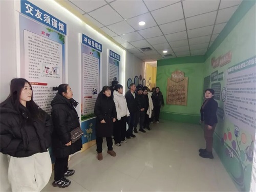 随后,家长们和学生一起参观我校法治教育基地,张玲艳老师结合基地内的案例展板,为大家开展了一场生动详实的法治知识讲解。在心理健康教育基地,郑迎冬老师详细介绍了我校心理健康教育的工作体系与特色活动,并与在场家长围绕青少年心理疏导话题展开交流。