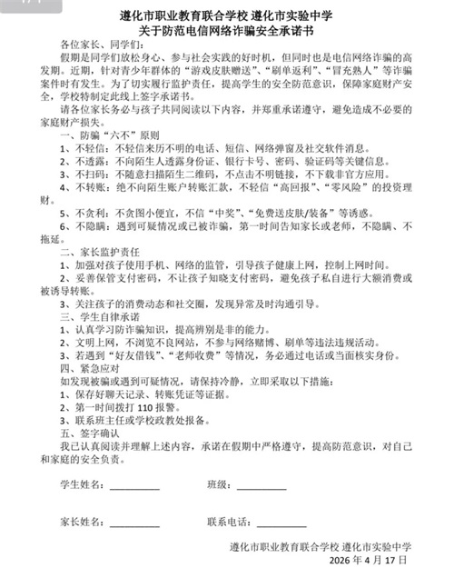 学校向全体学生家长发放《防范电信网络诈骗安全承诺书》,围绕反诈防骗责任、日常教育引导、信息保护等核心内容明确家校双方职责。一纸承诺书,不仅是家校反诈的责任约定,更让反诈防骗的责任意识深植每一位家长心中,构建起家校同心、共防共治的反诈防护网。