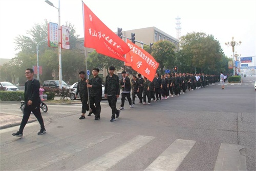 清晨7:00,薄雾微蒙,职教中心新生军训连队已经集合完毕,学生处王树祥主任作了军训动员,王怀平校长宣布出发。