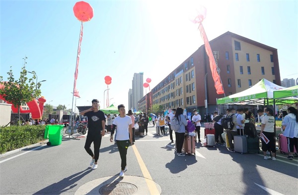因防控疫情的原因,所有家长不能进入校园,只能送至大门口,而后便只能目送孩子走进校园。经过行李消毒、扫码认证、测量体温,新生才能踏入校园。新生进行登记,领取宿舍钥匙和校园一卡通,并将14天健康信息登记表、核酸检测报告单、个人健康承诺书上交才算报道成功。