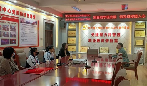 4月1日,曹妃甸区职教中心毕业生高稳来校看望资助学生19秋高考2班田雅鑫、19秋平面设计班孟欣。副校长杨景悦、团委书记孙晓飞陪同座谈。