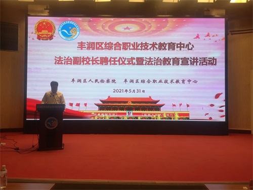 为贯彻落实国务院《关于进一步加强和改进未成年人思想道德建设的实施意见》和《未成年人保护法》,切实做好学校安全教育工作,进一步加强未成年人的法律意识,引导未成年人自觉遵纪守法,学会用法律武器保护自己,有效避免未成年犯罪。在严格按照上级疫情防控要求下,2021年5月31日上午,丰润区综合职业技术教育中心举行法治副校长聘任仪式暨法治教育宣讲活动,参加此次活动的领导有丰润区检察院党组书记、代检察长单庆梅,区检察院党组成员、副检察长蒋建忠,区教育局主任科员郝良瑜,区教育局安法科科长翟建军,丰润区职教中心校党总支书记、校长孙宏伟,学校全体中层以上领导干部及部分师生参加此次活动,由副校长冷建增主持。