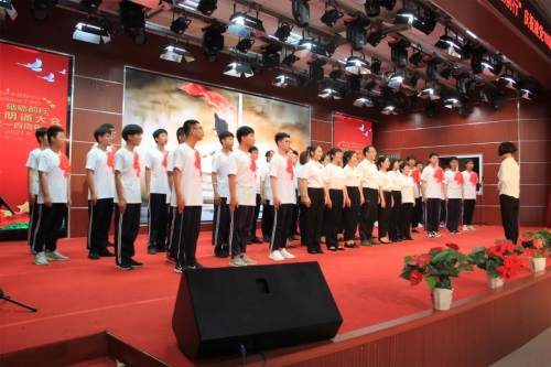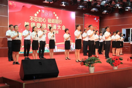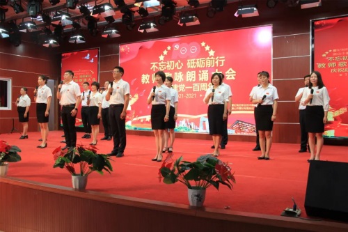 《永远的旗帜,永远的中国梦》《百年征程百年初心》《今日之中国正如您所愿》《百年中国》《百年颂党》等诗文及《唱支山歌给党听》《没有共产党就没有新中国》等歌声将一幅幅画卷缓缓展开,一句句一声声发自肺腑的真情表达,倾诉着对祖国母亲、对中国共产党的感激与热爱。老师们的表演紧扣主题,形式多样,或娓娓道来、韵味深长,或气势磅礴、慷慨激昂。他们用饱满的激情礼赞伟大的党、伟大的祖国、伟大的英雄,为党的百年华诞献上了最真挚的祝福。活动最后,现场全体师生共同唱响《没有共产党就没有新中国》,大家用饱含深情的歌声向经典致敬,现场歌声催人奋进,气势振奋人心。