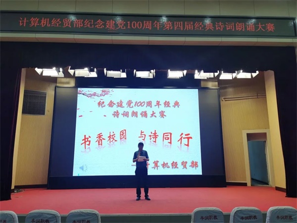 为纪念中国共产党建党100周年,进一步丰富校园文化生活,营造浓厚的书香校园氛围,借以传承经典诗词文化,弘扬民族文化精髓,激发学生的读书和诵读热情。2021年6月24日下午,丰润职教中心举办了第四届“书香校园 与诗同行”经典诗词朗诵大赛。计算机经贸部刘福龙主任、语文教师张艳霞等13人担任评委,计算机经贸部全体师生观赛。