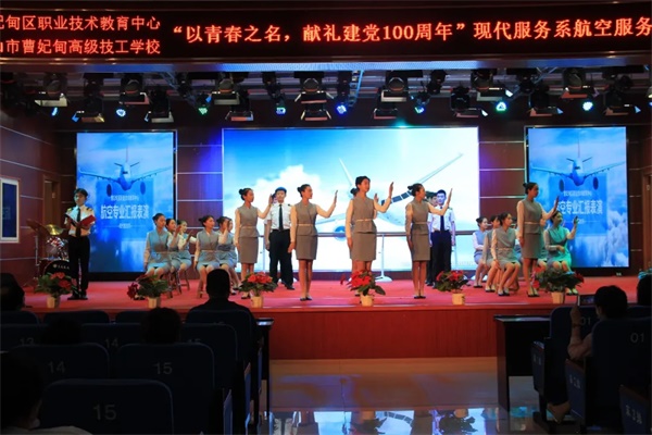 6月24日下午,曹妃甸区职教中心现代服务系在多功能厅举办“以青春之名,献礼建党100周年”航空专业汇报表演。副校长刘辉、杨景悦、李志坚及相关处室负责同志与现代服务系学生一起观看了演出。
