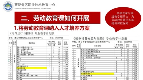 一是开足开齐劳动教育课程。为贯彻落实教育部《大中小学劳动教育指导纲要(试行)》《人力资源社会保障部关于加强技工院校劳动教育的实施意见》(人社部发[2020]27号)精神,我校从2020年秋季学期开始,将劳动教育课程纳入新生入学第一学期公共必修课程,每周一课时,单独设课与渗透教学相结合,为劳动教育教学实施提供课程保障。在2021年春季学期开学第一课活动中以“劳动创造美好生活”为主题,面向全体学生从疫情防控不松懈、技能成就梦想来展开教育。让学生崇尚技能先锋、技能报国,帮助同学们明确目标,树立自信心,努力成为德智体美劳全面发展的高素质技能人才。