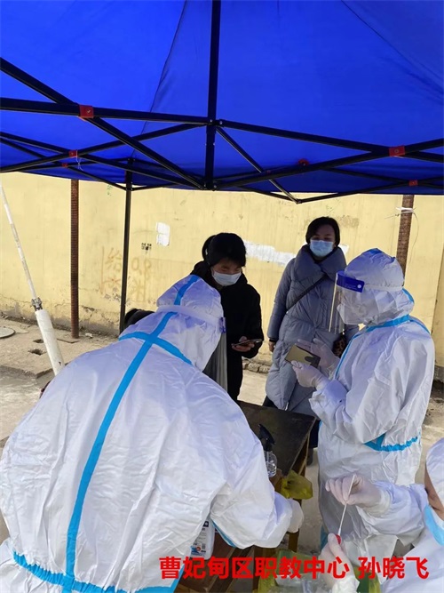 3月20日起,在曹妃甸区各个社区检测点,职教中心党员志愿者们身着防护服,不惧严寒,各尽其责,全力以赴与医务人员并肩作战。他们大多数都是学校一线教师,同时还承担着网课教学任务。三尺讲台,教书育人,他们是可亲可敬的人民教师;疫情来袭,身先士卒,他们是义无反顾的教师志愿者。他们按照要求,积极组织社区人员保持安全距离有序排队,认真做好核酸检测人员的电脑登记和记录工作,对每位检测者充满耐心与热心,“您好,请提前准备好核酸检测码”“您好,请保持间隔一米距离”……这样的话语一天不知道重复多少遍,纵然嗓子干哑、脚步沉重,但始终没有懈怠。