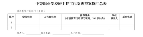 探索适应中职学生特点和技术技能人才成长规律的班主任工作室建设机制、方法,培育建设一批班主任工作室,推动各地各中职学校进一步提高班主任队伍专业化水平,建设一支优秀的班主任工作队伍。