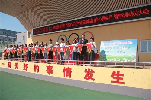 会上,校长王怀平、副校长李志坚共同为本学期平安管理计时牌揭牌,与会领导为各班级授予平安管理流动红旗,学生处王树祥主任作《收心思学 珍爱健康 静心做事》主旨报告,李志坚副校长作军训动员讲话,全体同学进行宣誓——《学生日常行为守则》,校长王怀平宣布军训开营。