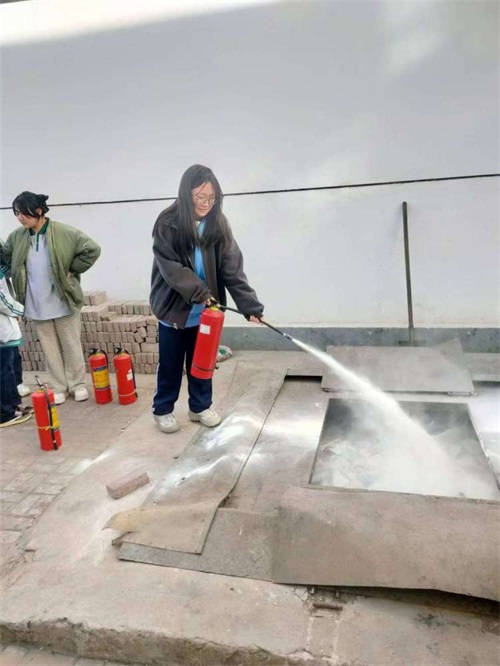 教导处杨建超主任和张炳博两位老师给学生和学校新参加工作的老师演示灭火器的正确使用方法。