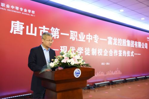 唐山市第一职业中专与富龙控股集团有限公司签署校企合作协议,双方领导共同见证校企合作的重要时刻,推动了校企合作的持续稳定,标志着唐山市第一职业中专现代学徒制的深化发展。