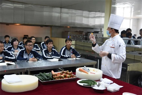 在中西餐烹饪实训室,鸿宴大师正在为同学们讲解刀法技巧,领导们实地查看了中餐烹饪、西餐烹饪专业学生上课实况,点评了同学们课堂制作的糕点。