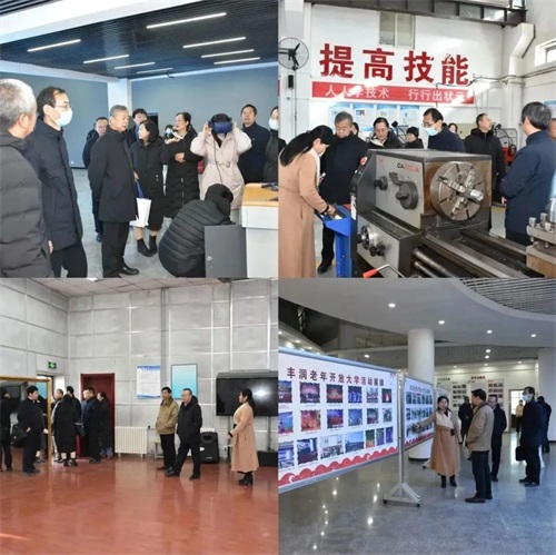 专家组在校党委副书记、校长冷建增、校党委委员、副校长宋久臣、开放大学主任王守宽等陪同下参观校园,开放大学副主任高明建对丰润开放大学的发展历史、校园文化建设、教学师资、教学场所设备、合作办学等进行全面讲解。