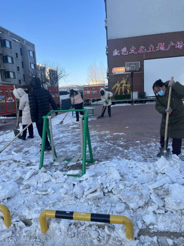 刘瑞书记带领卫校教师,发扬志愿服务精神,进入新永安里小区清扫积雪。