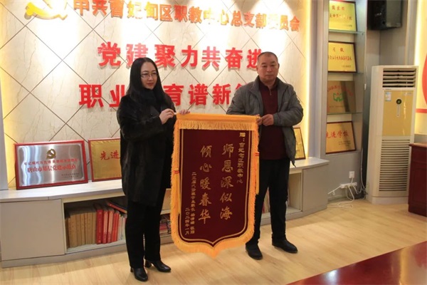 职教中心一贯重视困难学生的学习生活问题,通过提供勤工俭学岗位,为品学兼优学生解决经济困难问题,减轻生活负担。23汽车班杨立杰家长感谢学校的用心良苦,特赠送锦旗,感谢学校的耐心教育和引导,让孩子树立了正确的人生观和价值观;感谢学校对孩子的倾力培养,使他们在学业上取得优异的成绩;感谢学校对孩子生活上的悉心照顾,使他们能健康成长。张丽君副校长代表学校接受家长赠旗。
