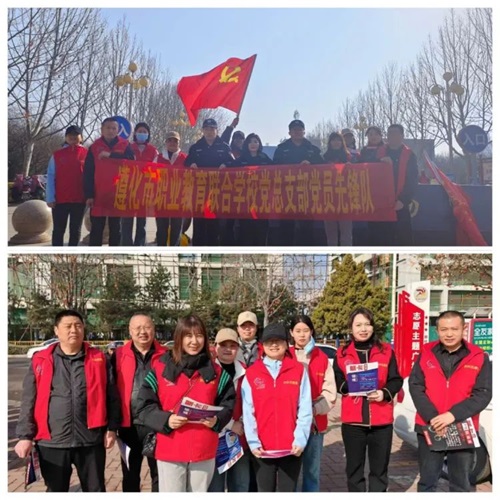 3月22日上午,遵化市职业教育联合学校党总支部部分党员和优秀团员志愿者一起,在人民广场与市公安局反诈中心联合开展“共建法治遵化 共享美好生活”法治宣传活动,协助遵化市公安局发放反诈传单,为文明城市创建贡献自己的力量。