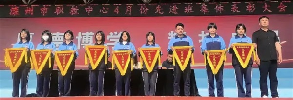 张剑主任宣读了获得“先进班集体”荣誉称号的班级名单,各获奖班级代表依次上台,校领导为他们颁发流动红旗并合影留念。现场气氛热烈,掌声不断,展现了职教学子昂扬向上的精神风貌。