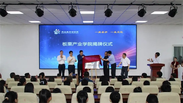 在热烈掌声中,河北科技师范学院、迁西县板栗产业发展中心及职教中心领导共同为板栗产业学院揭牌。