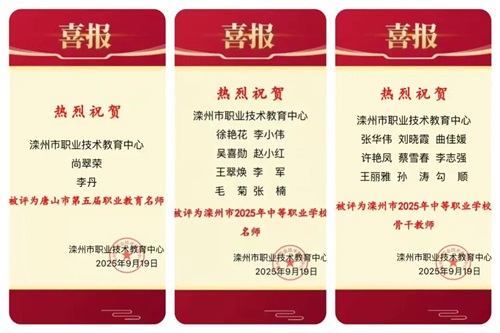 此次获评名师骨干,是对他们辛勤付出的最高肯定,更是滦州市职教中心教育教学质量稳步提升的生动见证。相信这些优秀教师将继续发挥示范引领作用,带动更多同仁深耕教学、精进技艺,共同书写滦州职教事业的新篇章!