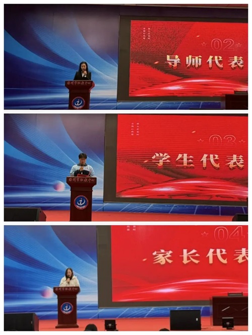 导师代表肖英老师发言,诠释“成长引路人”的使命——用专业素养与爱心陪伴学子成长;学生代表赵子鸣同学表态,展现“虚心求教、勤学笃行”的决心;家长代表胡嘉程妈妈分享感悟,奏响家校共育的“同心曲”。