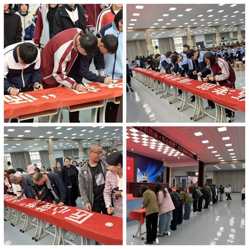 签名仪式上,导师、学生与家长代表共同在横幅上留下名字与寄语。