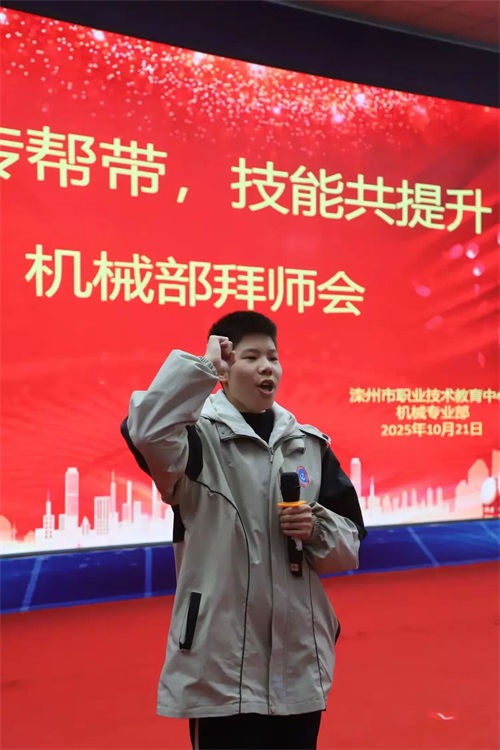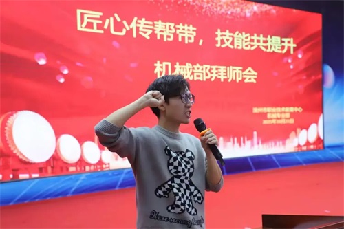 同学们纷纷举起右手,庄严宣誓:“我将尊师重道,虚心求教,刻苦钻研,勤于实践,不负导师期望,努力成为技能扎实、品德高尚的机械人!”