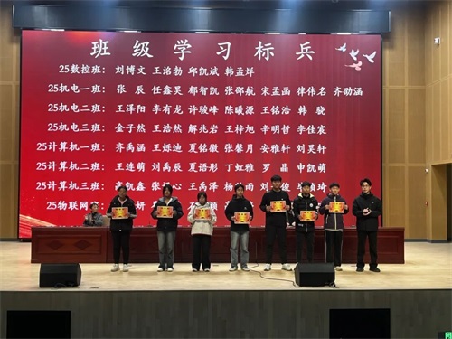 表彰环节是大会的核心亮点。高一年级主任助理崔志会依次宣读了45名班级学习标兵、30名单科状元及8名年级学习标兵的获奖名单,并由艾福顺、刘一洁、赵婉茹三位老师为获奖学生颁奖,这不仅是对优秀学生努力付出的认可,更激发了全体同学争先创优的热情。随后,年级学习标兵代表25机电一班张辰同学分享了自己的学习经验,从时间规划、错题整理、学科平衡等实用角度出发,毫无保留地传递高效学习方法。