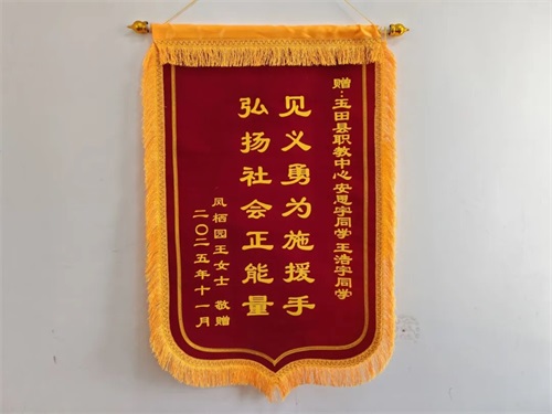 2025年11月17日,风正寒,情更暖。三面承载着深厚情谊与高度认可的锦旗送至我校。其中一面来自唐山市百合供应链管理有限责任公司,表彰我校“融行”志愿服务队在玉田县第四届电商节中的暖心服务;另两面则由玉田县凤栖园居民王女士专程送到学校,感谢我校两名同学在危急时刻挺身而出、见义勇为的高尚行为。这三面锦旗,既是对学生个人品德的高度赞扬,也是对我校坚持“立德树人、德技并修”育人理念的生动印证。
