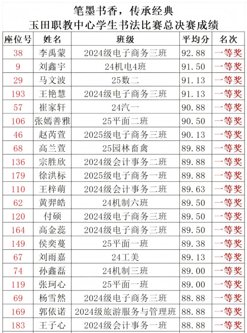 为保证评选结果的权威性与公正性,学校组建了由各专业部推举的语文教师和优秀书法教师等14人组成的专业评审组,从书写规范、字形结构、章法布局等多个维度进行严格评审。最终评选出一等奖21人、二等奖37人、三等奖58人、优秀奖67人。本次书法比赛是学校“十百千”系列活动的重要一环,更是落实推普周“写好规范字”要求的特色实践。通过“班级-专业部-学校”三级竞赛体系,实现了全员参与、层层选拔。同学们的作品不仅展现了扎实的书法功底,更体现了对中华优秀传统文化的深刻理解。