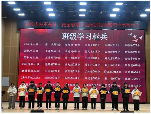 演讲环节结束后,期中考试总结表彰正式拉开帷幕。活动对在本次考试中表现突出的班级学习标兵、单科状元、进步明星、年级学习标兵等优秀学生进行了隆重表彰。教师代表依次为获奖学生颁发奖状,同学们昂首挺胸、接过荣誉,脸上洋溢着自豪的笑容。