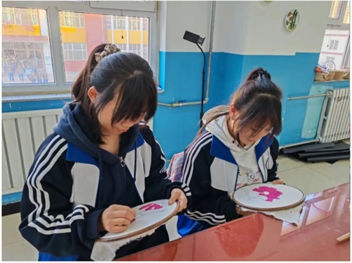 在刘明辉、冯冬雪两位教师的带领下,同学们分组协作,探索不同材质的创作可能。他们将羽毛球的羽毛分类整理、裁剪、粘贴,辅以巧妙构图,制作成一幅幅细腻灵动、富有层次的“羽毛画”;旧篮球、足球的表皮被巧妙裁剪,结合其他材料,重塑为栩栩如生的七星瓢虫和卡通娃娃花托;实心球在学生的画笔下则化身为球形立体小景观,雅趣横生。对于球拍类器材,羽毛球拍的网状结构就成为天然的画布框架,同学们在拍网上“刺绣”,创作出别具一格的“球拍刺绣画”;板羽球拍则成了最好的画板,一方小小的空间,收纳了绘画人眼中五彩斑斓的世界;乒乓球拍承载起传统掐丝工艺,精美程度令人赞叹。