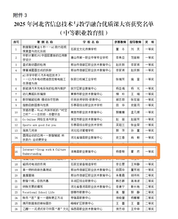 近日,2025年河北省信息技术与教学融合优质课大赛获奖名单正式公布。滦南职教中心机电部教师杨香敬凭借扎实的教学功底、创新的教学设计及对信息技术与教学的深度融合实践,在赛事中脱颖而出,荣获省级一等奖,为学校再添殊荣!