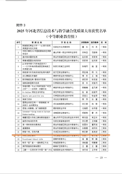 近日,河北省信息技术与教学融合优质课大赛(中等职业教育组)评选结果正式公布。我校韩志群老师凭借扎实的教学基本功和创新的教学设计,在七千多名参赛选手中脱颖而出,荣获二等奖。这一佳绩彰显了我校在推进教学改革、深化信息技术与教学融合方面取得的显著成效。