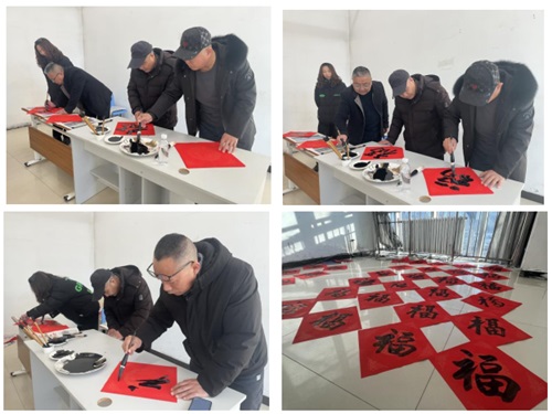 活动现场,红幅铺展,墨香四溢。三位老师挥毫示范,从握笔姿势、运笔技巧到间架结构,耐心细致地讲解福字的书写要领,一笔一划尽显书法艺术的精妙。教职工们热情高涨,纷纷提笔蘸墨,在老师们的悉心指导下认真临摹。落笔之间,或遒劲有力、或舒展飘逸的福字跃然纸上,一张张红彤彤的福字承载着大家对新年的美好期许,现场洋溢着欢乐祥和的节日气息。