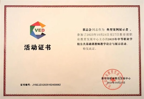 截至12月22日,由教育部职业教育发展中心主办的2025年中等职业学校教学设计与展示活动圆满落下帷幕。我校6名教师参赛且载誉而归,其中崔志会入选“典型案例展示者”并完成现场展示;王金、颜巧歌、李亚男、许智超、江丽颖五位教师荣获“案例展示者”称号。