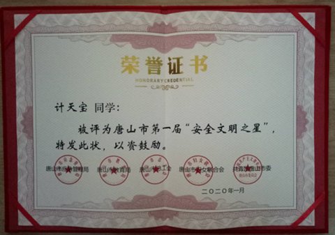 玉田职教中心一名学生荣获唐山市首届“安全文明之星”荣誉称号