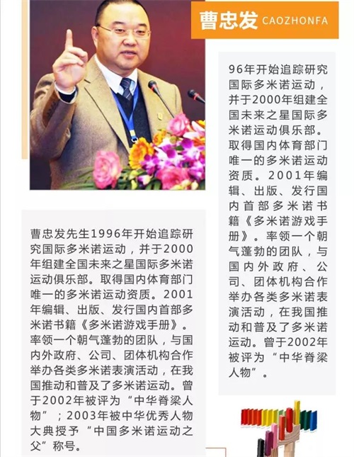 曹忠发老师1996年开始追踪研究国际多米诺运动,并于2000年组建全国未来之星国际多米诺俱乐部。取得国内体育部门唯一的多米诺运动资质。2001年编辑、出版、发行国内首部多米诺书籍《多米诺游戏手册》。率领一个朝气蓬勃的团队,与国内外政府、公司、团体机构合作举办各类多米诺表演活动,在我国推动和普及了多米诺运动。曾于2002年被评为“中国脊梁人物”;2003年被中华优秀人物大典授予“多米诺运动之父”称号。